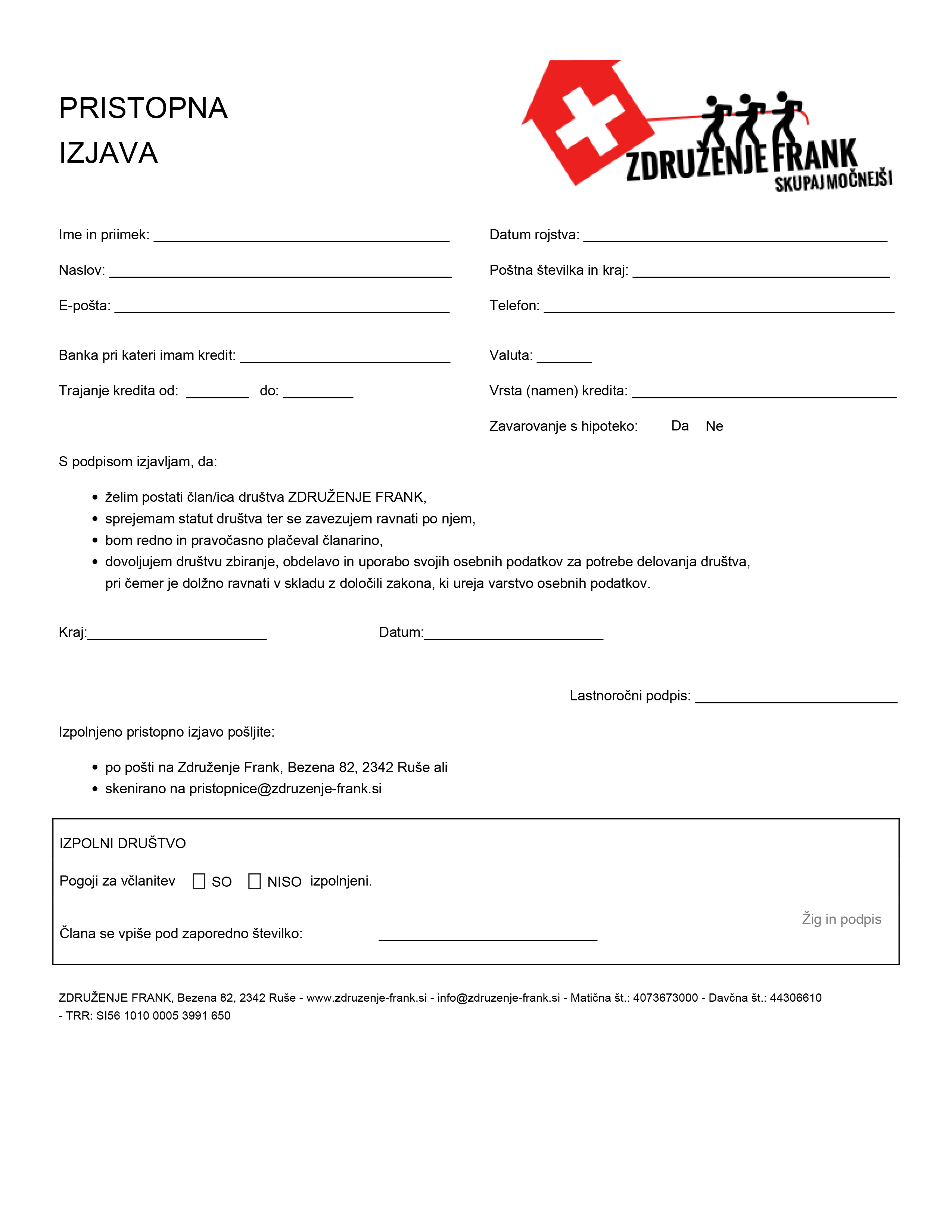 Pristopnico izpolnite s pomočjo vnosnih polj spodaj. Po elektronski pošti boste prejeli PDF dokument, ki ga natisnite, podpišite, skenirate in pošljete na elektronski naslov pristopnice@zdruzenje-frank.si. Če te možnosti nimate, ali pa ne prejmete PDF dokumenta po elektronski pošti, lahko prevzamete PRISTOPNICO PDF ali sliko pristopnice v obliki PNG ali JPG, jo izpolnite in pošljete po pošti na naslov Združenje Frank, Bezena 82, 2342 Ruše.